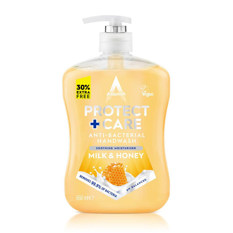 Astonish Handwash Protect & Care in Milk & Honey offers a pleasantly mild and efficient handwashing solution. Utilize this 650ml pump bottle of handwash effortlessly, blending the soothing qualities of milk and honey for a thorough cleaning and protection of your hands. The formulation hydrates and nurtures the skin, effectively removing debris and microorganisms. After each use, hands feel revitalized and subtly scented, exuding a delightful fragrance reminiscent of milk and honey.