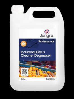 A citrus-based cleaner and degreaser that has been formulated with citrus solvents for maximum cleaning power. Jangro Industrial Citrus Cleaner Degreaser is fast-acting to remove even the most stubborn soiling with ease. Ideal to clean dirt, grime, diesel oil, food oil, fats, grease, tobacco film, body fat, mineral oils, rubber, traffic film, and engineering oil from stainless steel, vinyl, paint, ceramic, plastic, anti-slip surfaces and concrete.
