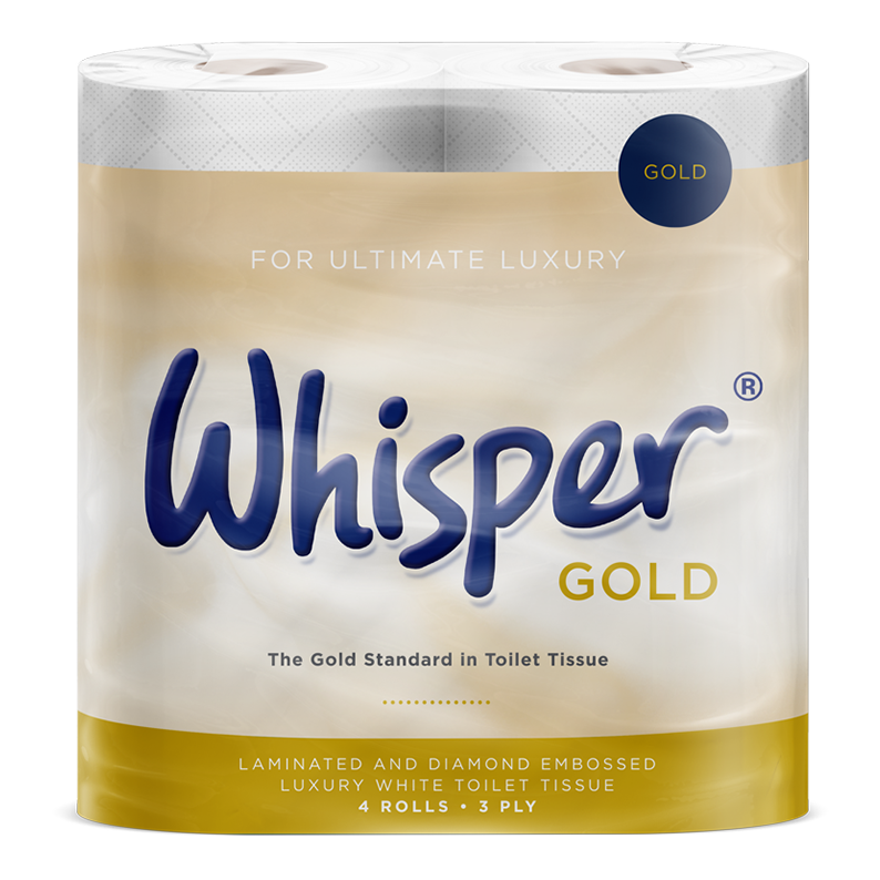 The Whisper Gold premium triple soft toilet tissue comes in packs of 40, each containing 160 sheets. This luxury 3-ply toilet tissue, made from pure pulp, offers a soft and luxurious feel.