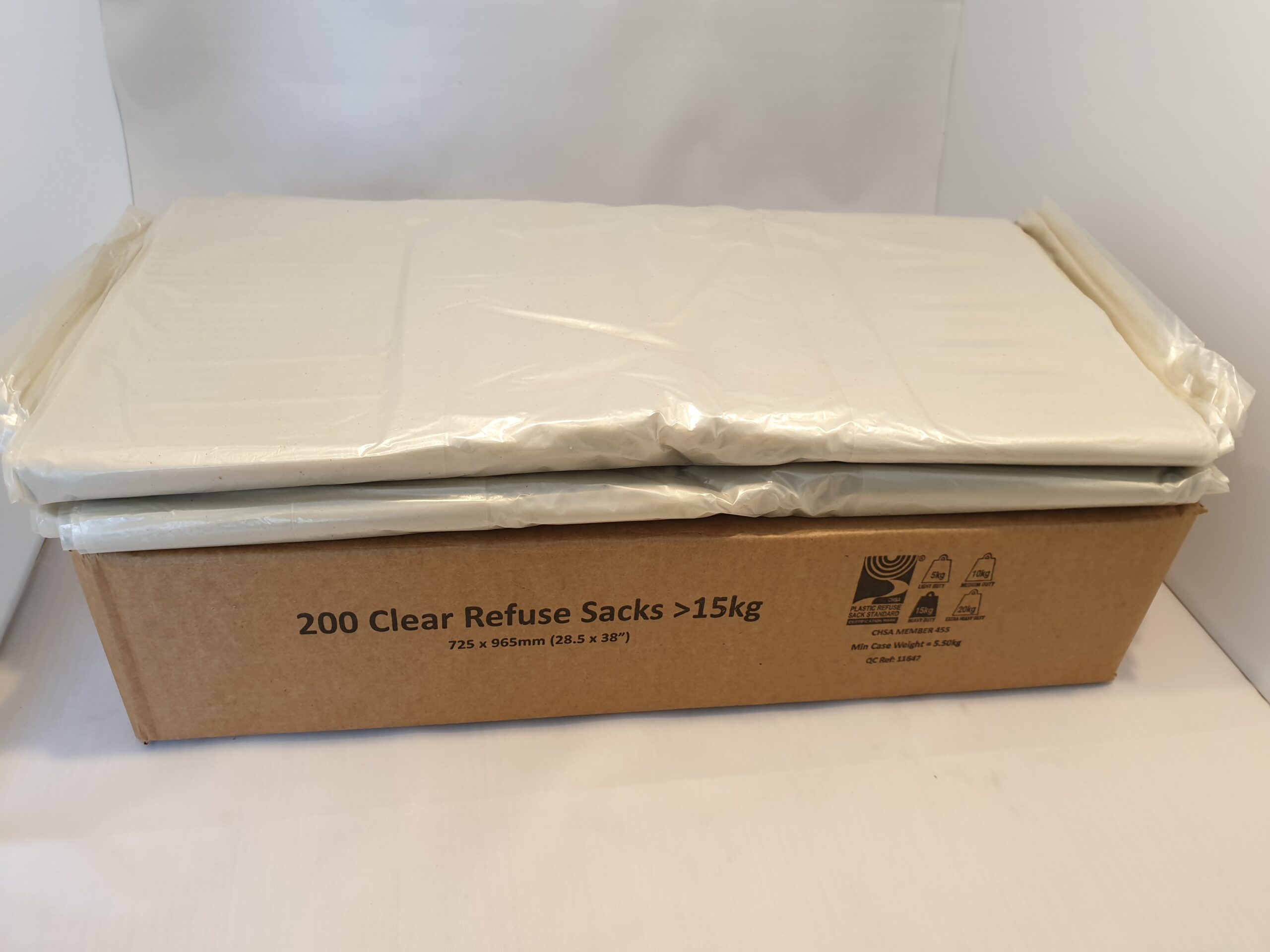 Refuse sacks, sized at 28 by 38 inches and weighing 15 kg, are spacious plastic bags designed for waste disposal. Their clear or translucent colour allows for easy identification of contents, while their sturdy construction ensures they can hold large volumes of trash effectively.